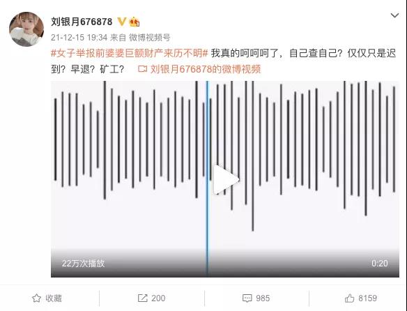 近日,河南一女子通过新浪微博@刘银月676878实名举报前婆婆吃空饷 一事在网上引起不小热议。12月15日,中国农业发展银行河南省分行微信公众号对此事通报表示,吃空饷不属实,但发现旷工。15日晚,该女子再次发微博表示:我真的呵呵呵了,自己查自己?仅仅只是迟到?早退?矿工?|上游新闻|